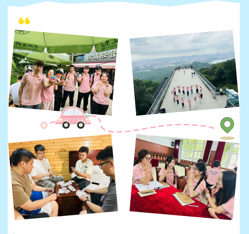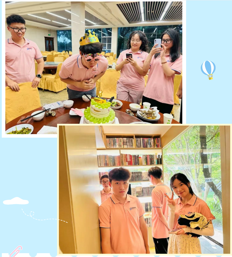 “我最難忘的是團隊小伙伴為我慶祝生日!六月初六那天我無意中提到當(dāng)天是我農(nóng)歷生日。說者無意,聽者有心,2個組的小伙伴立刻做了生日策劃,將我瞞的很好。晚餐時,當(dāng)?shù)案舛松蟻恚艺娴谋桓袆拥搅耍∷行』锇槎紴槲腋吲d,送上最真誠的祝福,教官也幫我們合影留念,我感受到了感動的關(guān)鍵詞——熱情,真的挺難忘的!”——行政綜合部 盧應(yīng)琪